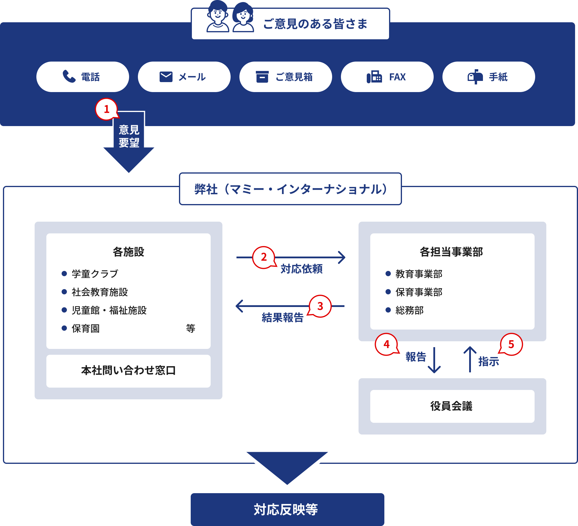 皆さまから寄せられたご意見などは、担当する各部署がその対応方法を検討し、運営の参考とさせていただきます。